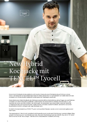 Die Hybrid-Kochjacke besteht aus TENCEL™ Lyocell und recyceltem Polyester, was sie zu einer verantwortungsbewussten