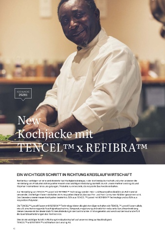 Das Gewebe unserer neuen Kochjacken besteht zu 50% aus TENCEL™ Lyocell mit REFIBRA™ Technology und zu 50% aus