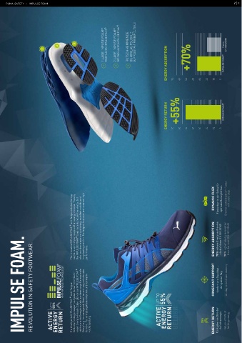 IMPULSE  SAFETY  IN REVOLUTION  Die intelligente IMPULSE.FOAM ® Anti-Fatigue Sohlentechnologie reagiert auf jeden deiner Schritte mit einem Energie-Impuls. Dabei gibt dir der IMPULSE.FOAM ® nicht nur aktiv Energie zurück, sondern sorgt für maximale hervorragende Stabilität und lang anhaltenden Komfort. Für ermüdungsfreies Arbeiten und konstante  55%  ENERGY RETURN  Rückgabe von 55% der  Auftrittsenergie  Return of 55% of  landing energy
