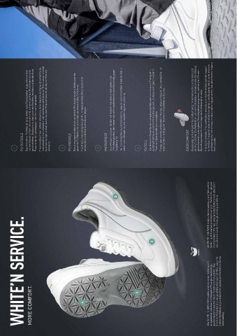 WHITE’N  COMFORT.  MORE       4                           1                                  Alle WHITE ´N SERVICEModelle sind mit einem Sohlenprofil ausgestattet, welches noch bessere Flüssigkeitsableitung gewährleistet und somit mehr Rutschhemmung bietet. Das direkt im Fersenbereich eingebettete Gelkissen IQ.CELL sorgt für höhere Stoßdämpfung und damit für optimalen Komfort im harten  Arbeitsalltag.