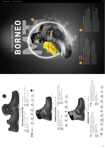 CASCADES  CORDURA ® , PUMA DISC Schnürrsystem  Vollrindleder BreathActive Funktionsfutter  COMPOSITE  glattes Vollleder BreathActive Funktionsfutter  39 - 47  COMPOSITE STEEL MIDSOLE  BORNEO  Fiberglaskappe und Stahlzwischensohle flexibler Metatarsal Ristschutz mit Microban ® -Schutz, TPU Gelenkschutz mit High-Rebound Foam, Kragen und Lasche aus weichem Veloursleder  METATARSAL   COMPOSITE  PROTECTION