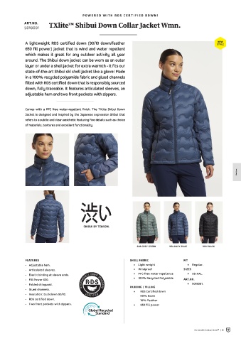Comes with a PFC free water-repellent finish. The TXlite Shibui Down