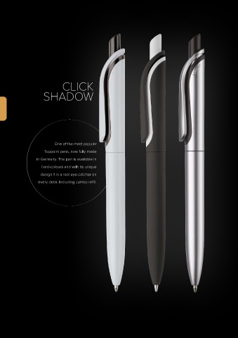 CLICK SHADOW One of the most popular Toppoint pens, now fully made in Germany. The pen is available in hard-colours and with its unique design it is a real eye-catcher on every desk. Including Jumbo refill.